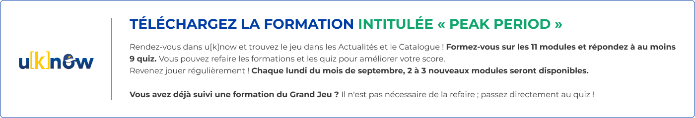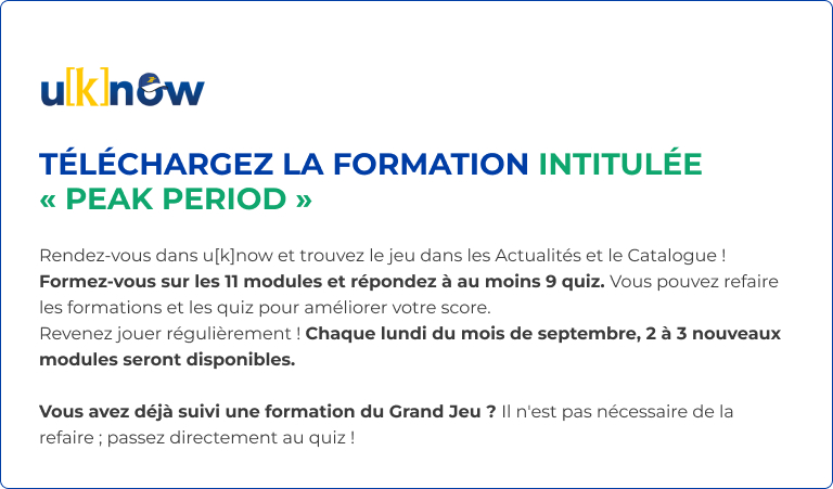 Apprenez ou révisez les notions importantes pour la Peak Period dans l'application « u[k]now » de votre FACTEO !